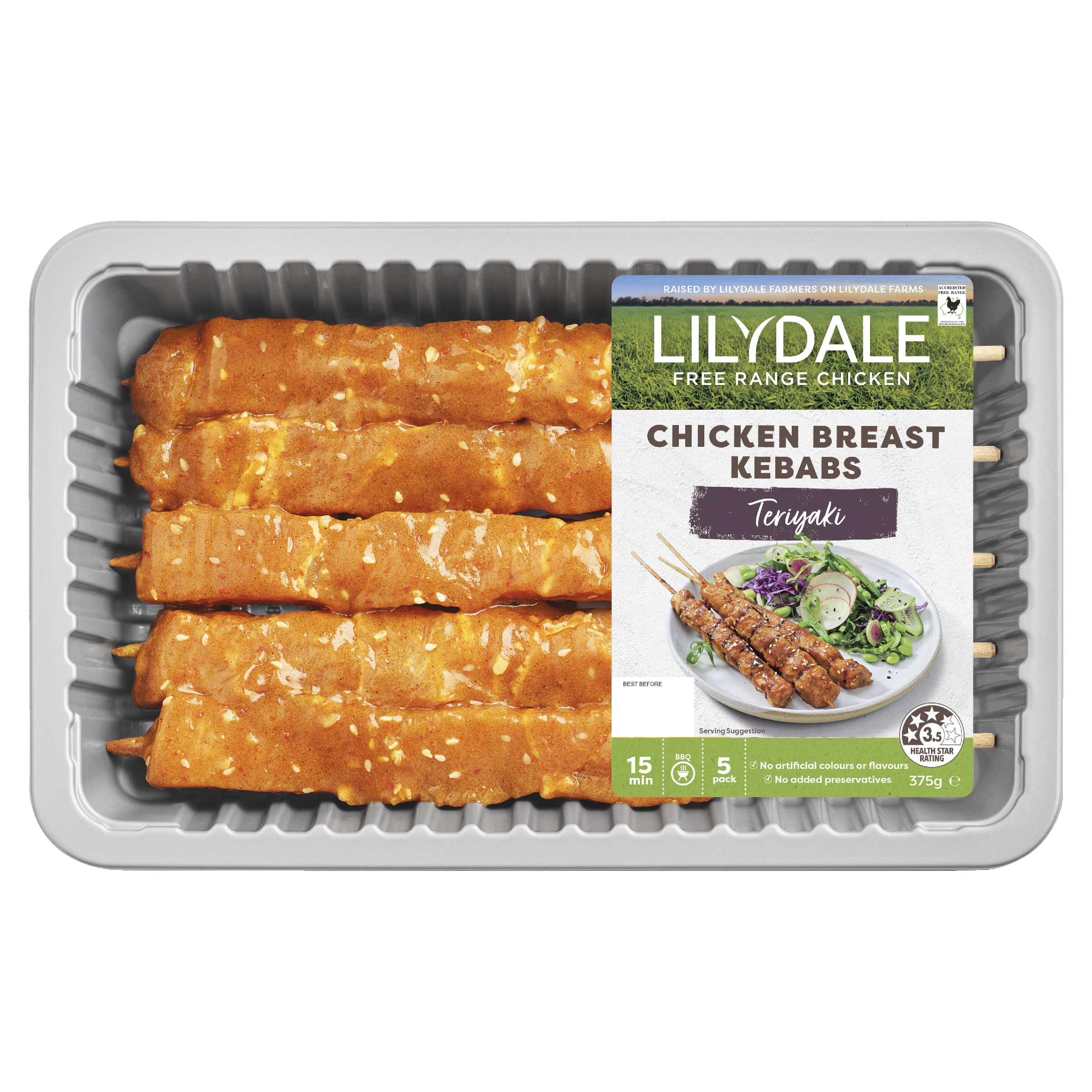 Summer barbequing with the Lilydale Free Range Teriyaki Breast Kebabs. Expertly marinated with a slightly sweet and deliciously savoury glaze. Ready to grill – simply serve with fresh Asian greens. Raised by Lilydale Farmers on Lilydale Farms.
