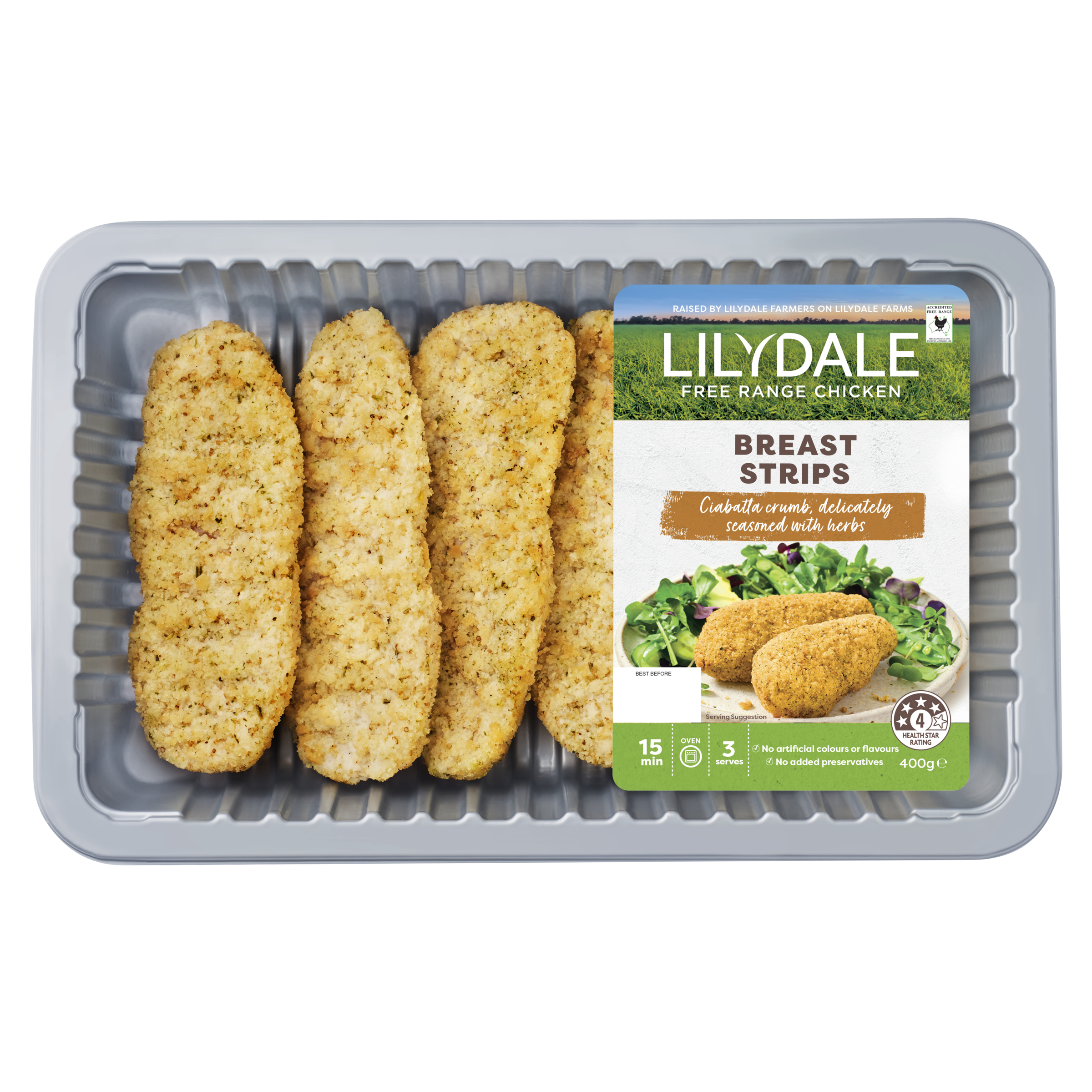 Convenient yet flavourful, the crispy Lilydale Free Range Chicken Breast Strips are coated in a ciabatta homestyle crumb and seasoned with oregano, parsley and rosemary. Simply bake, fry or air fry to enjoy with fresh greens for an easy dinner, or serve as dippers on a spicy dip share plate. Raised by Lilydale Farmers on Lilydale Farms.