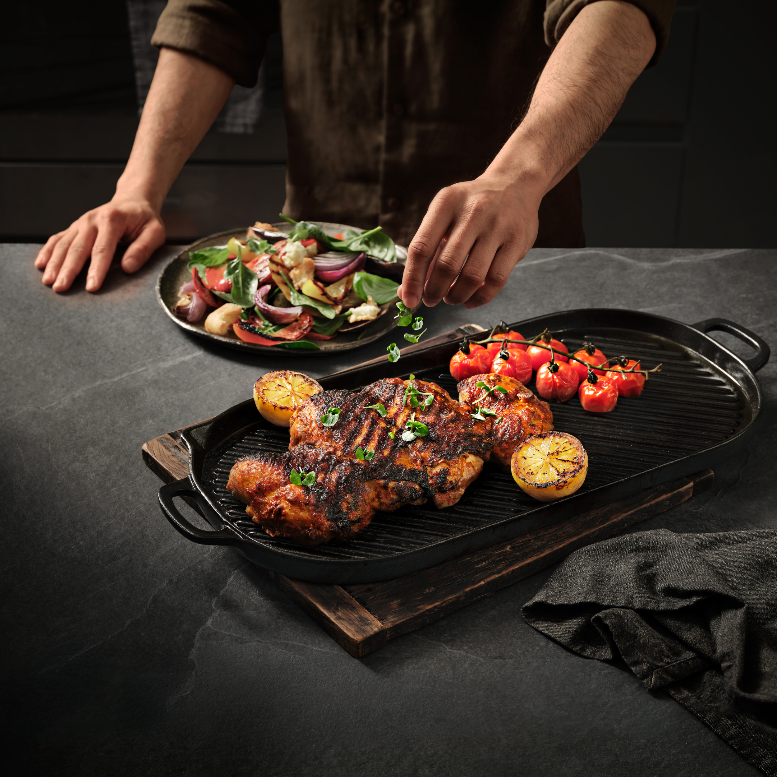• Dress the chicken with a scatter with fresh parsley and serve with charred lemon halves.